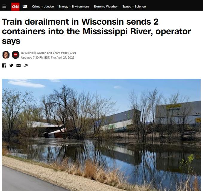 美國(guó)威斯康星州一火車(chē)脫軌 多節(jié)車(chē)廂掉進(jìn)密西西比河