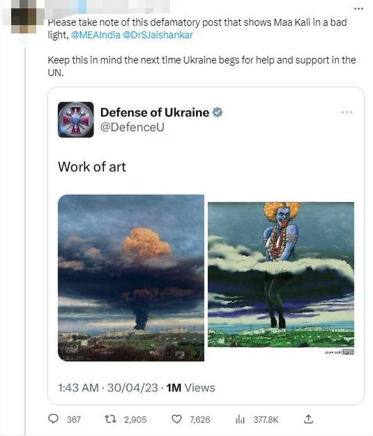 《印度斯坦時(shí)報(bào)》稱,這張圖被認(rèn)為丑化了印度教女神,是“對(duì)印度教的不尊重”,推文“遭到強(qiáng)烈反對(duì)”“傷害了印度人的感情”。甚至有印度網(wǎng)友呼吁印度官方干預(yù)此事。目前,烏克蘭國(guó)防部已經(jīng)刪除該推文。