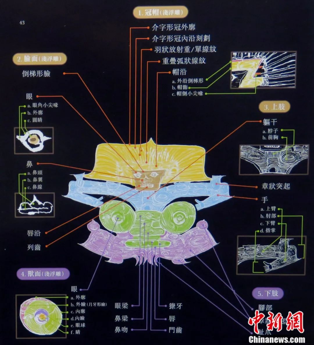 這個(gè)圖案的主體為“神人”,面部呈倒梯形,眼睛、鼻子、牙齒都非常寫實(shí)?!吧袢恕鳖^上還戴有高聳的羽冠,內(nèi)層刻有連續(xù)卷云紋的帽飾,外層為放射狀羽翎大冠。“神人”的四肢都以陰紋細(xì)刻而成,上肢作抬臂、彎肘狀,五指平張?!吧袢恕钡纳硐率且恢环诘厣系纳瘾F(形似老虎),外框有橢圓形的眼瞼,之間以橋形凸面相連,有鼻梁和鼻翼,闊嘴內(nèi)有尖利的牙齒。