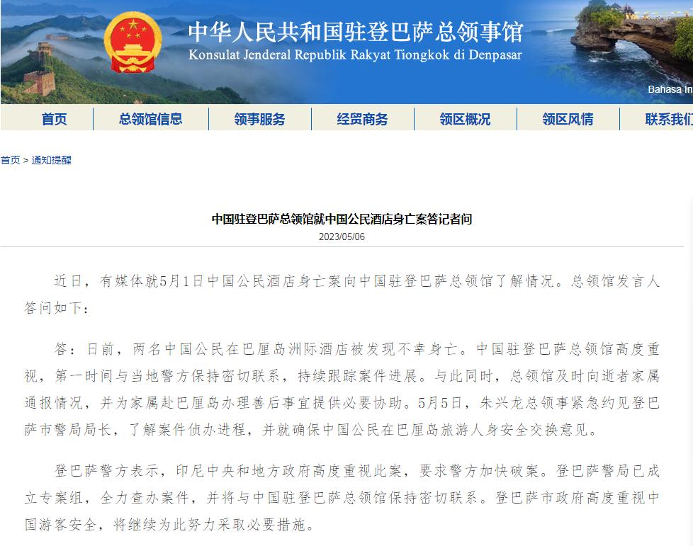 答:日前,兩名中國公民在巴厘島洲際酒店被發(fā)現(xiàn)不幸身亡。中國駐登巴薩總領(lǐng)館高度重視,第一時間與當(dāng)?shù)鼐奖3置芮新?lián)系,持續(xù)跟蹤案件進(jìn)展。與此同時,總領(lǐng)館及時向逝者家屬通報情況,并為家屬赴巴厘島辦理善后事宜提供必要協(xié)助。5月5日,朱興龍總領(lǐng)事緊急約見登巴薩市警局局長,了解案件偵辦進(jìn)程,并就確保中國公民在巴厘島旅游人身安全交換意見。