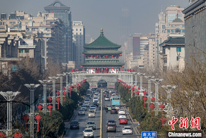 2023年1月7日,西安城墻永寧門,游覽城墻風光的游客絡(luò)繹不絕,熙熙攘攘。圖為從永寧門城墻上遠眺鐘樓。