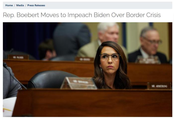 勞倫·博伯特表示,“拜登故意無(wú)視移民法,允許美國(guó)南部邊境遭到‘入侵’。拜登不能也不愿意忠實(shí)履行美國(guó)總統(tǒng)的職責(zé)。為了捍衛(wèi)憲法,眾議院必須彈劾拜登,讓他對(duì)嚴(yán)重違反就職誓言的行為負(fù)責(zé)?!?/p>
