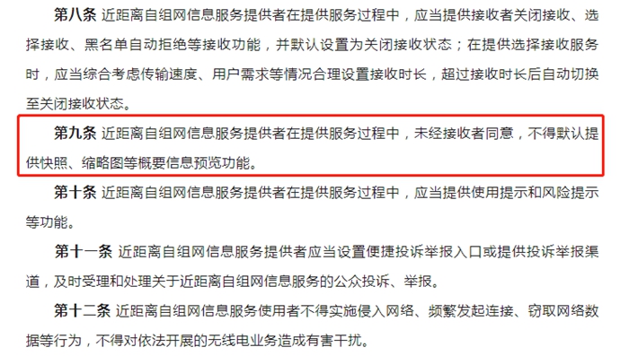 征求意見稿還提出,近距離自組網(wǎng)信息服務(wù)提供者在提供服務(wù)過程中,應(yīng)當(dāng)提供接收者關(guān)閉接收、選擇接收、黑名單自動拒絕等接收功能,并默認設(shè)置為關(guān)閉接收狀態(tài)。(完)