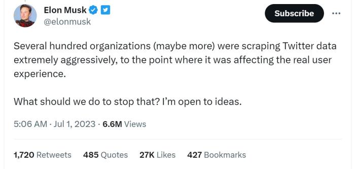 他還發(fā)布推文稱(chēng),數(shù)百個(gè)甚至更多的組織正在“極其積極地”抓取推特?cái)?shù)據(jù),“這影響了真正的用戶(hù)體驗(yàn)”,但馬斯克尚未說(shuō)明限制會(huì)持續(xù)多久,也并未表示在什么條件下將取消限制。