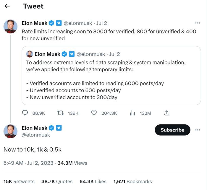 對(duì)此,馬斯克很快做出了反應(yīng)。在宣布最初限制后僅幾小時(shí),他又發(fā)文稱(chēng),將限制提高到了已驗(yàn)證賬戶(hù)8000條、未驗(yàn)證賬戶(hù)800條、新的未驗(yàn)證賬戶(hù)400條,并在當(dāng)天再次將限制瀏覽量分別提高到了10000條、1000條和500條。