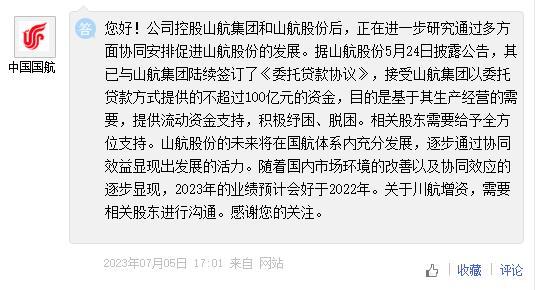 對于上述收購,中國國航于7月5日在投資者互動平臺回應(yīng)稱,公司控股山航集團(tuán)和山航股份后,正在進(jìn)一步研究通過多方面協(xié)同安排促進(jìn)山航股份的發(fā)展。