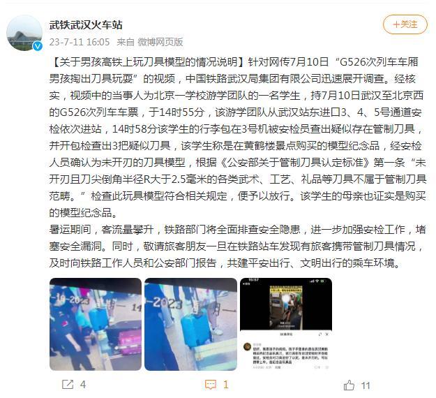 經(jīng)核實,視頻中的當(dāng)事人為北京一學(xué)校游學(xué)團隊的一名學(xué)生,持7月10日武漢至北京西的G526次列車車票,于14時55分,該游學(xué)團隊從武漢站東進口3、4、5號通道安檢依次進站,14時58分該學(xué)生的行李包在3號機被安檢員查出疑似存在管制刀具,并開包檢查出3把疑似刀具,該學(xué)生稱是在黃鶴樓景點購買的模型紀(jì)念品,經(jīng)安檢人員確認(rèn)為未開刃的刀具模型,根據(jù)《公安部關(guān)于管制刀具認(rèn)定標(biāo)準(zhǔn)》第一條“未開刃且刀尖倒角半徑R大于2.5毫米的各類武術(shù)、工藝、禮品等刀具不屬于管制刀具范疇?!睓z查此玩具模型符合相關(guān)規(guī)定,便予以放行。該學(xué)生的母親也證實是購買的模型紀(jì)念品。