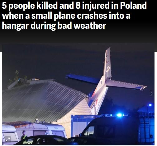據(jù)報道,當(dāng)天,波蘭國家消防局發(fā)言人莫妮卡·諾瓦科斯卡·布林達(dá)(Monika Nowakowska-Brynda)表示,“波蘭中部的克辛諾(Chrcynno)地區(qū),受惡劣天氣影響,一架塞斯納型飛機(jī)在降落時墜入跳傘中心的機(jī)庫,事發(fā)時有10人在機(jī)庫中,飛行員和在機(jī)庫中躲避暴風(fēng)雨天氣的4名人員遇難?!?/p>