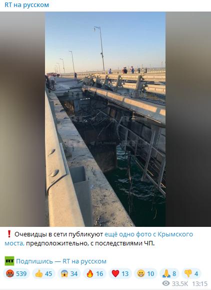 俄媒“今日俄羅斯”(RT)發(fā)布了據(jù)稱是目擊者在克里米亞大橋事件后拍攝的大橋圖片。圖片來源:RT社交媒體截圖