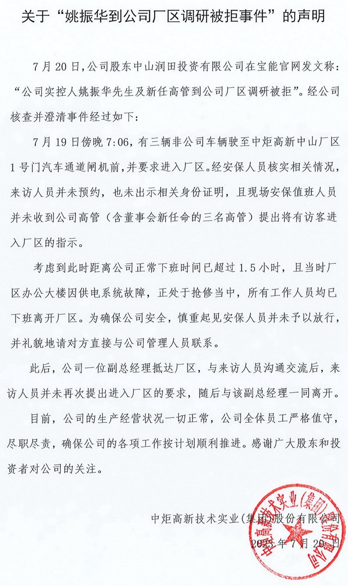 近日,“寶能系”股東中山潤(rùn)田在寶能集團(tuán)官網(wǎng)發(fā)布聲明稱,寶能集團(tuán)董事長(zhǎng)姚振華得知中炬高新日常管理工作出現(xiàn)重大紕漏的相關(guān)情況后,非常擔(dān)憂上市公司的生產(chǎn)安全及食品安全問(wèn)題,趕往中山中炬高新總部,調(diào)研生產(chǎn)經(jīng)營(yíng)情況。未曾想,竟被保安拒絕進(jìn)入。