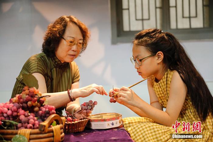 祖孫二人正在做“葡萄?!薄V行戮W(wǎng)記者 翟璐 攝
