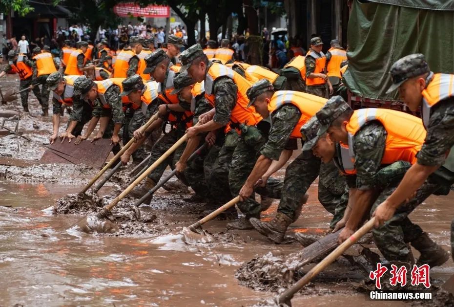 2023年7月4日,重慶市萬州區(qū)五橋河河水猛漲,武警重慶總隊(duì)執(zhí)勤第三支隊(duì)官兵在清理街道淤泥。
