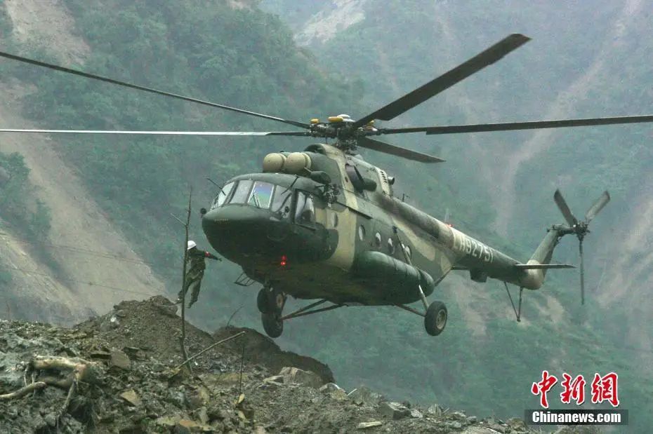 2008年5月20日,成都軍區(qū)陸航團(tuán)姜廣偉王牌直升機(jī)組上午十時以單輪首次成功強(qiáng)降北川重災(zāi)區(qū)“定時炸彈”——堰塞湖無名塌方小土堆上。中新社記者 賈國榮 攝
