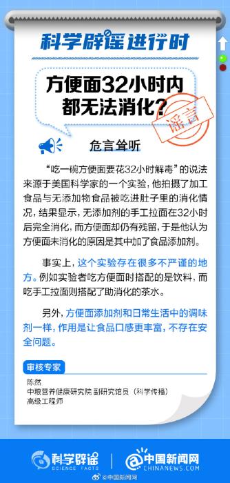 中新網(wǎng)8月1日電 “吃一碗方便面要花32小時解毒”的說法來源于美國科學(xué)家的一個實驗,但這個實驗存在很多不嚴(yán)謹(jǐn)?shù)牡胤?。方便面添加劑和日常生活中的調(diào)味劑一樣,作用是讓食品口感更豐富,不存在安全問題。(來源:@科學(xué)辟謠 @中國新聞網(wǎng) )