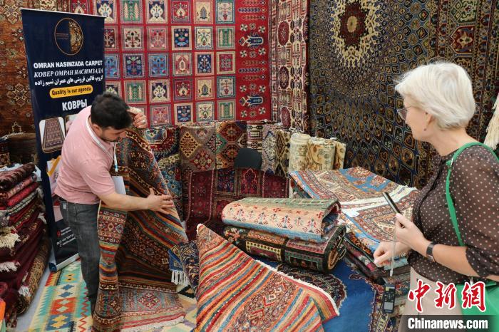 當?shù)貢r間8月3日,哈薩克斯坦阿斯塔納,阿富汗商品展當日啟幕。圖為展商向哈顧客展示阿富汗手工羊毛地毯?! ≈行戮W(wǎng)記者 張碩 攝