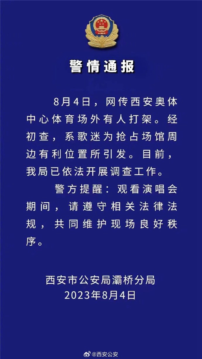 當(dāng)晚,根據(jù)網(wǎng)傳西安奧體中心體育場(chǎng)外打架一事,西安市公安局灞橋分局發(fā)布警情通報(bào)。