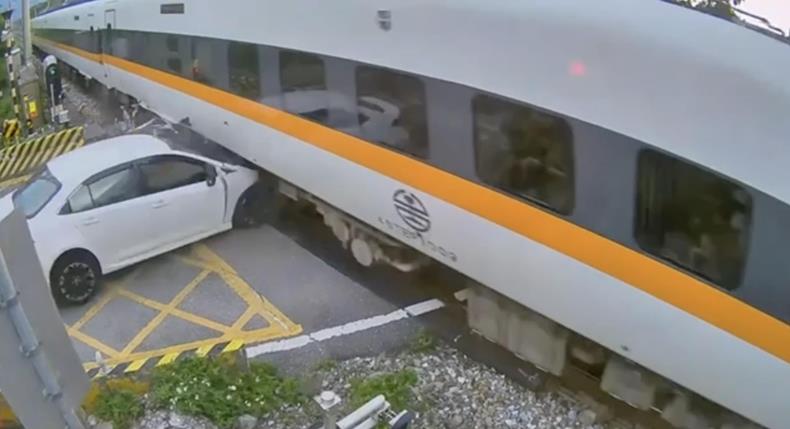 白色轎車直沖行進間太魯閣列車,造成列車與轎車毀損。 圖片來源:臺灣《聯(lián)合報》