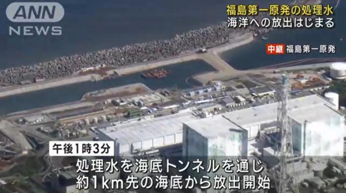 當?shù)貢r間24日下午1時許,日本將福島核污染水排入大海。圖片來源:日本朝日電視臺視頻截圖