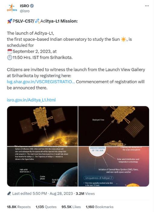 報道稱,作為印度首個專門研究太陽的任務(wù),“太陽神-L1號”(Aditya-L1)將成為印度空間研究組織新的里程碑。