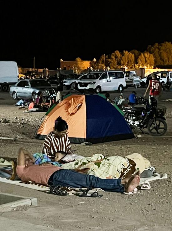 抵達(dá)目的地瓦爾扎扎特,已是9日凌晨1時(shí)左右。記者看到,許多當(dāng)?shù)孛癖娫隈R路上席地而眠。4名結(jié)伴的當(dāng)?shù)厍嗄旮嬖V記者:地震發(fā)生時(shí)大家都很害怕,紛紛來(lái)到廣場(chǎng)上,因?yàn)閾?dān)心余震,今晚就打算這樣過(guò)夜了。