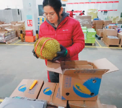 兩個多小時后,在北京市海淀區(qū)的一個快遞站點,京東快遞員侯建東從傳送帶上拿到了一箱榴蓮。