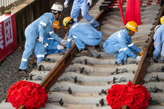 3月31日,在印度尼西亞雅加達雅萬高鐵哈利姆車站,工人鋪設(shè)雅萬高鐵全線最后一根鋼軌。