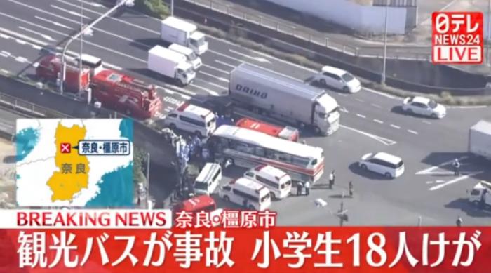 據(jù)報(bào)道,事發(fā)時(shí)車內(nèi)共有34名小學(xué)生,另外還有3名教師,一行人原本是計(jì)劃前往奈良公園參加遠(yuǎn)足活動(dòng),但在橿原市一個(gè)路口發(fā)生車禍。