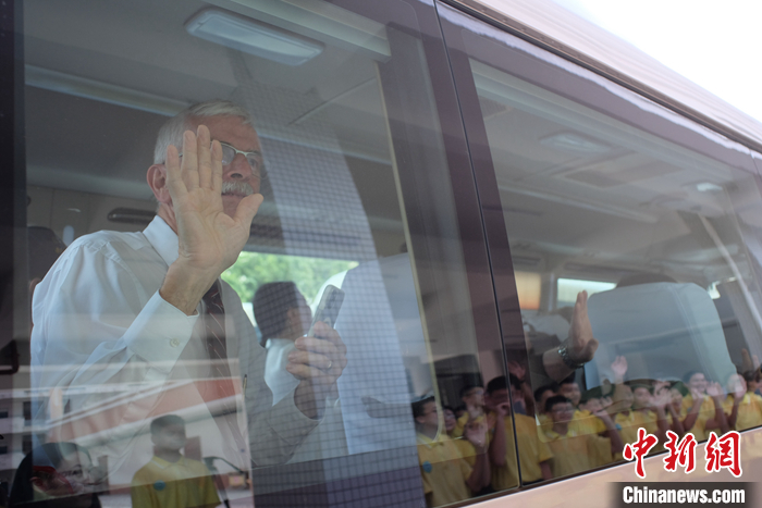 圖為臨別時,代表團(tuán)成員與學(xué)生揮手告別。 中新社記者 劉俊聰 攝
