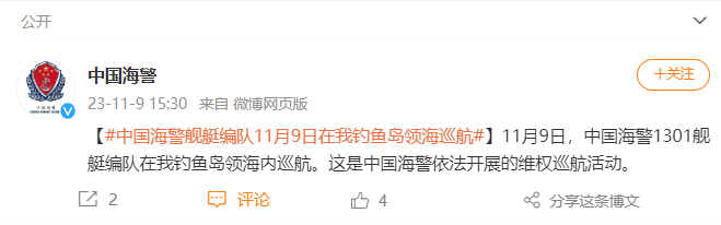 中新網(wǎng)11月9日電 據(jù)中國(guó)海警局官方微博消息,11月9日,中國(guó)海警1301艦艇編隊(duì)在我釣魚(yú)島領(lǐng)海內(nèi)巡航。這是中國(guó)海警依法開(kāi)展的維權(quán)巡航活動(dòng)。