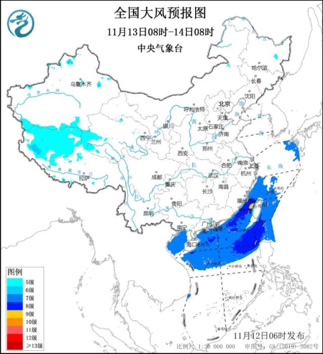 12日08時至13日08時,新疆沿天山地區(qū)和南疆盆地、青海東部和西部、福建東南部沿海地區(qū)、臺灣島等地部分地區(qū)將有5~6級、陣風(fēng)7~8級的大風(fēng);東海大部海域、臺灣海峽、臺灣以東洋面、巴士海峽、南海北部和中部海域、北部灣將有7~8級、陣風(fēng)9級的大風(fēng),其中臺灣海峽部分海域風(fēng)力可達(dá)9級、陣風(fēng)10級。13日08時至14日08時,新疆南疆盆地、西藏北部和西部、青海西部、福建東南部沿海地區(qū)、臺灣島等地將有5~6級、陣風(fēng)7~8級的大風(fēng);東海南部海域、臺灣海峽、臺灣以東洋面、巴士海峽、南海北部和中部海域、北部灣、瓊州海峽將有7~8級、陣風(fēng)9級的大風(fēng),其中臺灣海峽部分海域風(fēng)力可達(dá)9級、陣風(fēng)10級。中央氣象臺11月12日06時繼續(xù)發(fā)布大風(fēng)藍(lán)色預(yù)警。