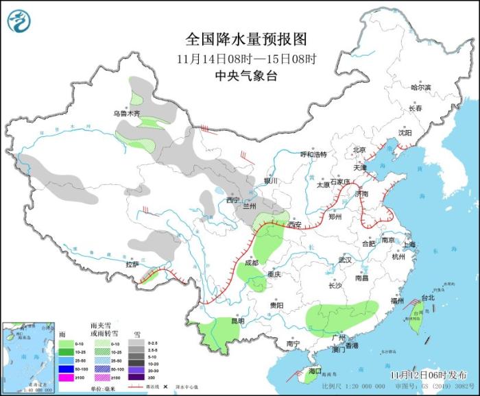 11月14日08時至15日08時,新疆沿天山地區(qū)和南疆西南部、西藏北部和東部、青海北部和東部、甘肅大部、寧夏南部等地部分地區(qū)有小雪或雨夾雪。甘肅南部、陜西南部、湖南南部、江西南部、福建西南部、四川盆地、云南中部和西南部、廣西東部、廣東中北部、海南島東部、臺灣島等地部分地區(qū)有小雨。內(nèi)蒙古西北部、青海西部等地部分地區(qū)有5~7級風(fēng)。臺灣海峽、北部灣、瓊州海峽將有7~8級、陣風(fēng)9級的大風(fēng)。