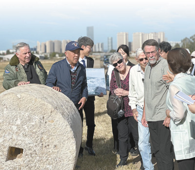 在云南昆明呈貢機場舊址,代表團一行聆聽講解員講述石碾背后的故事。呈貢機場曾是飛虎隊在昆明的主要基地之一,機場建設期間,當?shù)厝嗣窭瓌泳薮笫肫秸艿溃冻銎D苦努力。