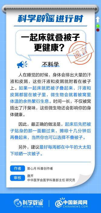 中新網(wǎng)11月17日電 人在睡覺(jué)的時(shí)候,身體會(huì)排出大量的汗液和皮屑,這些汗液和皮屑就附著在被子上。如果一起床就把被子疊起來(lái),汗液和皮屑都留在被子里,微生物會(huì)就著被窩里體溫的余熱繁衍生息。時(shí)間一長(zhǎng),不僅被窩捂出了汗臭味,這些微生物還會(huì)影響你的身體健康。(來(lái)源:@科學(xué)辟謠 @中國(guó)新聞網(wǎng) )
