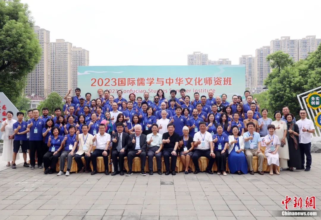 2023年8月14日,與會(huì)嘉賓和學(xué)院在活動(dòng)現(xiàn)場(chǎng)合影。當(dāng)日,由北京外國語大學(xué)與國際儒學(xué)聯(lián)合會(huì)聯(lián)合主辦的“2023國際儒學(xué)與中華文化師資班”開班儀式在江蘇省丹陽市舉行,來自20多個(gè)國家和地區(qū)的120名學(xué)員,參加為期13天的中華傳統(tǒng)文化研修。李國慶 攝