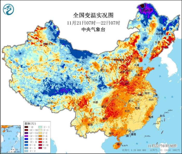 中新網(wǎng)11月22日電 據(jù)中央氣象臺網(wǎng)站消息,今晨,中東部大部地區(qū)仍有不同程度的回暖,但這也將是本輪寒潮過程來前最后的溫暖。目前冷空氣已經(jīng)開始影響黑龍江西北部,漠河今晨氣溫達(dá)到-27.3℃,比昨日同時刻降低20℃。中央氣象臺今晨繼續(xù)發(fā)布寒潮、暴雪、大風(fēng)三個預(yù)警。其中,未來24小時,內(nèi)蒙古東部、黑龍江中東部將有大范圍強降雪,需要特別小心!