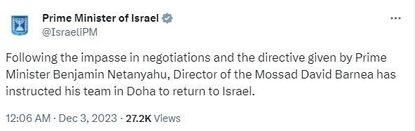 聲明稱(chēng),“談判陷入僵局后,經(jīng)(以色列)總理內(nèi)塔尼亞胡指示,(以色列情報(bào)機(jī)構(gòu))摩薩德負(fù)責(zé)人大衛(wèi)·巴尼亞命令其在多哈的團(tuán)隊(duì)返回以色列?!?/p>