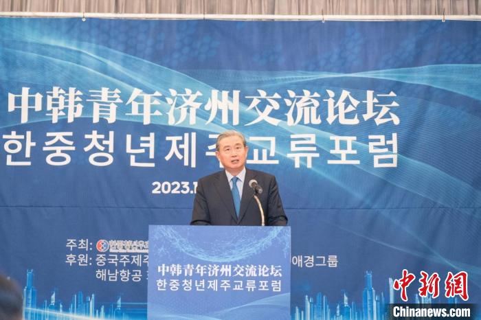 11月30日,中韓青年濟州交流論壇在韓國濟州舉行。圖為中國駐濟州總領(lǐng)事王魯新致賀詞。韓中青年友好協(xié)會 供圖