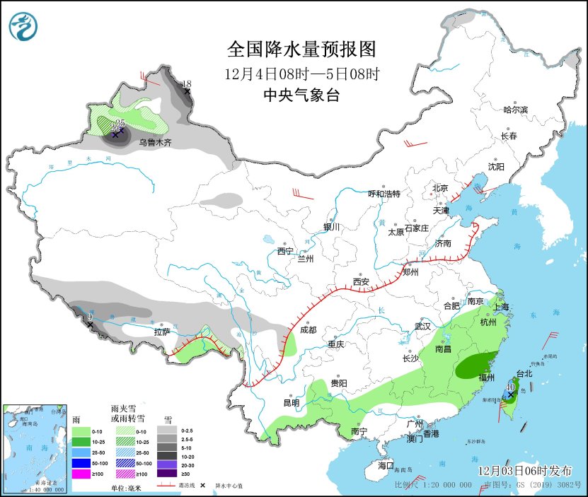 12月4日08時至5日08時,新疆北部、西藏西南部和東部等地部分地區(qū)有小到中雪或雨夾雪,其中,新疆北疆東部和沿天山地區(qū)、西藏西南部等地部分地區(qū)有大到暴雪,局地大暴雪(20~25毫米)。江南大部、云南東部和南部、華南北部和西部、臺灣島等地部分地區(qū)有小到中雨,其中,臺灣島中北部等地部分地區(qū)有大雨(25~40毫米)。內蒙古中西部、遼東半島、新疆北部等地部分地區(qū)有4~6級風。