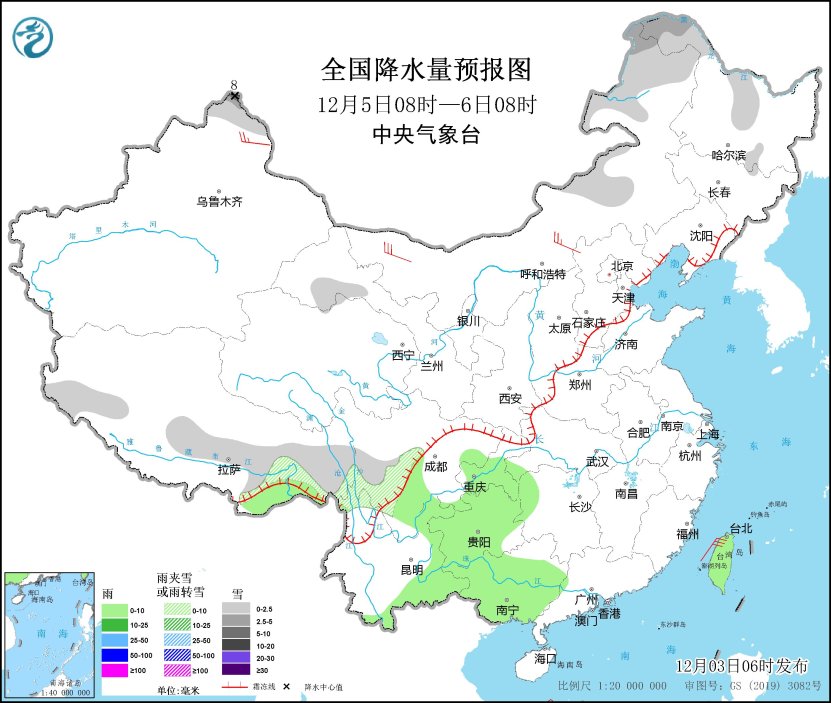 12月5日08時至6日08時,新疆北疆北部、內蒙古中東部、黑龍江西北部、西藏東部和北部、甘肅河西、川西高原等地部分地區(qū)有小雪或雨夾雪,其中,內蒙古東北部、黑龍江西北部、新疆北疆北部等地部分地區(qū)有中到大雪(5~8毫米)。西南地區(qū)東部、云南東部、廣西大部、臺灣島等地部分地區(qū)有小雨。新疆北部、內蒙古中西部等地部分地區(qū)有4~6級風。