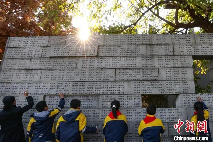 學(xué)生為名單墻上的名字描新。泱波 攝