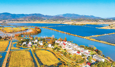 安徽省蕪湖市繁昌區(qū)平鋪鎮(zhèn)岱湖灘漁光互補(bǔ)光伏電站,水上發(fā)電、水下養(yǎng)殖,助力節(jié)能減排。