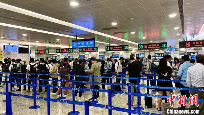 上海浦東國際機場邊檢查驗大廳,旅客有序排隊候檢。黃波 攝
