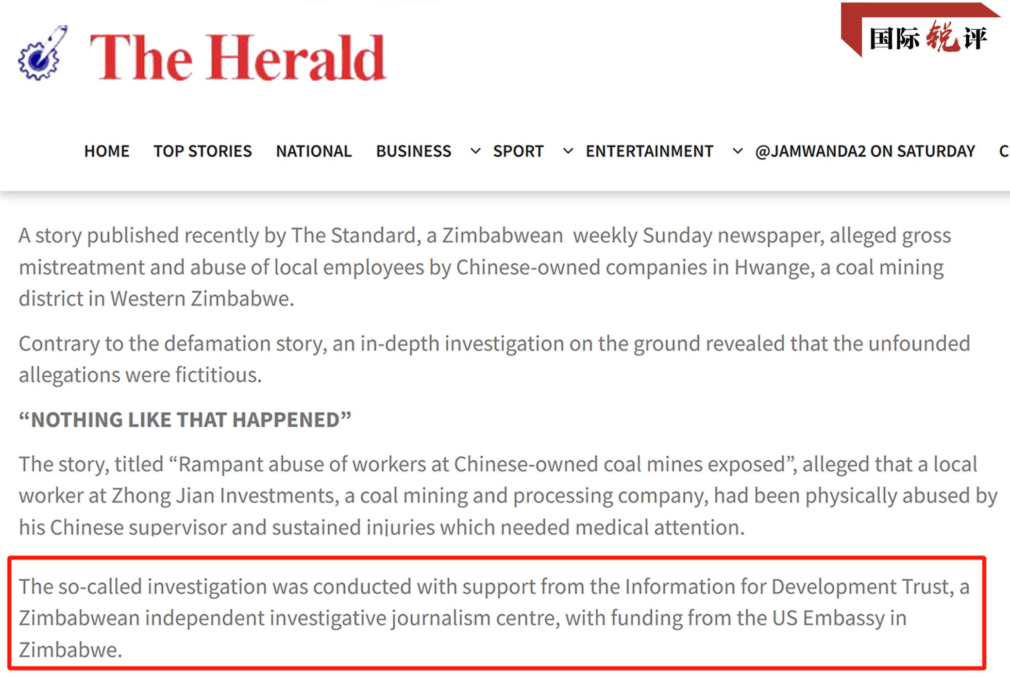 2022年5月,津巴布韋媒體《標(biāo)準(zhǔn)報》發(fā)布了一篇報道,污蔑中國礦企虐待當(dāng)?shù)貑T工,稱這名員工“受傷送醫(yī),還被解雇了”。這家媒體稱,報道是和津巴布韋一個名叫“信息促進(jìn)發(fā)展信托基金(IDT)”的機構(gòu)合作完成的。然而很快,津巴布韋《先驅(qū)報》就發(fā)文,用大量事實證明,這名員工只是和中方員工發(fā)生了小口角,并沒有被毆打,也沒有被解雇。