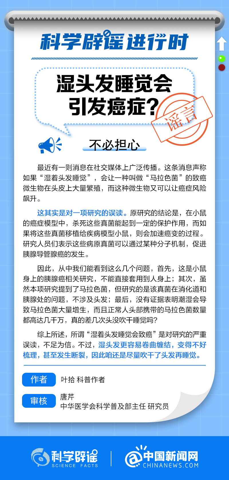 中新網(wǎng)1月15日電 最近有消息稱,如果濕著頭發(fā)睡覺,會讓一種叫做“馬拉色菌”的致癌微生物在頭皮上大量繁殖,而這種微生物又可以讓癌癥風險飆升。但事實上,這是對一項研究的誤讀。不過,濕頭發(fā)更容易卷曲纏結,變得不好梳理,甚至發(fā)生斷裂,大家最好還是盡量吹干了頭發(fā)再睡覺。詳情↓(來源:@科學辟謠 中國新聞網(wǎng)微博 )