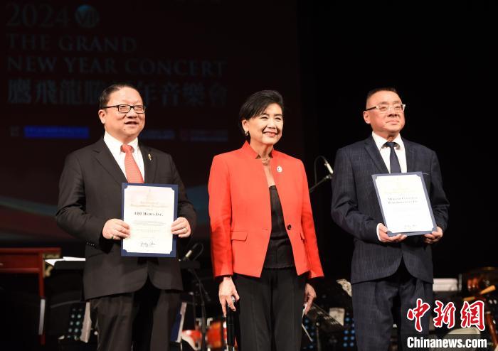 當(dāng)?shù)貢r(shí)間1月27日晚,以紀(jì)念中美建交45周年為主題的鷹飛龍騰新年音樂(lè)會(huì)在美國(guó)洛杉磯唱響。圖為美國(guó)聯(lián)邦眾議員趙美心(中)向美國(guó)鷹龍傳媒董事長(zhǎng)蘇彥韜(左)等主辦方代表頒發(fā)賀狀。 中新社記者 張朔 攝