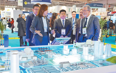 2023年11月在法國巴黎舉辦的第五屆世界核能工業(yè)博覽會(huì)上,中國核工業(yè)集團(tuán)工作人員在向法國原子能委員會(huì)負(fù)責(zé)人介紹展出內(nèi)容。