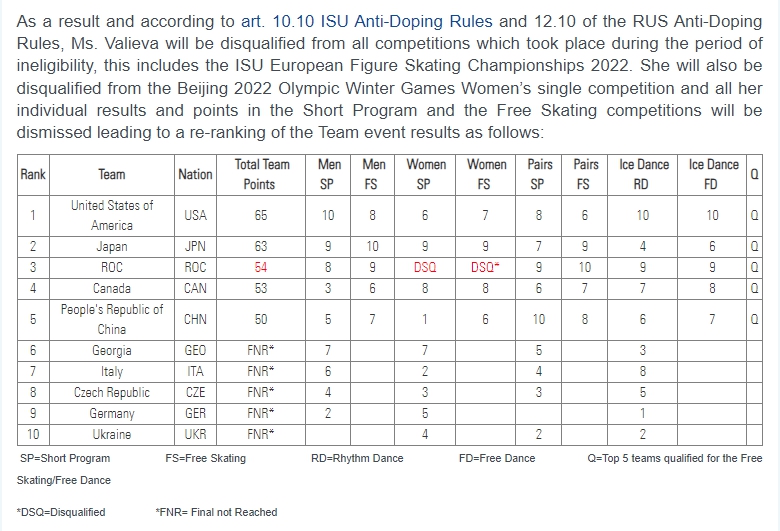 當(dāng)?shù)貢r間30日,國際滑聯(lián)對北京冬奧會花樣滑冰團(tuán)體成績進(jìn)行了重新計算,瓦利耶娃所獲得的成績積分被取消,俄羅斯奧委會代表團(tuán)在花樣滑冰團(tuán)體項目中的金牌變?yōu)殂~牌。
