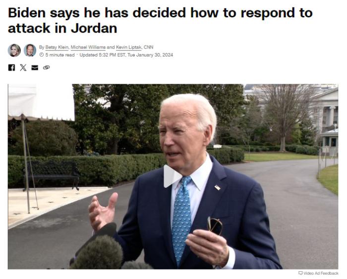 中新網(wǎng)1月31日電 據(jù)美國(guó)有線電視新聞網(wǎng)(CNN)報(bào)道,當(dāng)?shù)貢r(shí)間30日,美國(guó)總統(tǒng)拜登表示,他已就美國(guó)如何應(yīng)對(duì)約旦美軍基地遇襲事件做出決定。早些時(shí)候,該襲擊造成3名美軍士兵死亡、數(shù)十人受傷。
