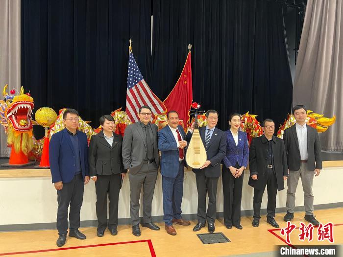 當(dāng)?shù)貢r(shí)間2月5日,中國(guó)人民大學(xué)附屬中學(xué)藝術(shù)團(tuán)在美國(guó)洛杉磯國(guó)際研究學(xué)習(xí)中心進(jìn)行交流演出。中國(guó)駐洛杉磯總領(lǐng)事郭少春及夫人王薇參贊等帶來(lái)中國(guó)傳統(tǒng)樂(lè)器贈(zèng)給學(xué)校,勉勵(lì)美國(guó)學(xué)生了解中國(guó)音樂(lè)和文化?!≈行律缬浾?張朔 攝