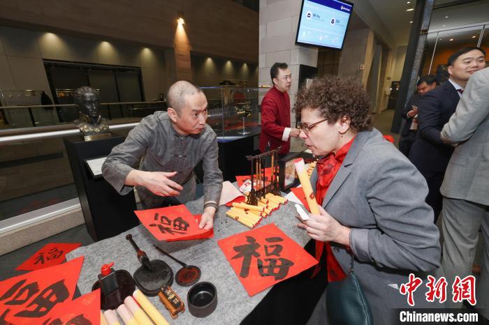 當(dāng)?shù)貢r(shí)間2月6日晚,加拿大蒙特利爾,中國(guó)駐蒙特利爾總領(lǐng)館與中國(guó)常駐國(guó)際民航組織理事會(huì)代表處在國(guó)際民航組織(ICAO)總部聯(lián)合舉辦“共慶春節(jié)”主題活動(dòng)。圖為當(dāng)?shù)厝A人書法家(左)向與會(huì)嘉賓講解以中國(guó)書法書寫的“福”字?!≈行律缬浾? 余瑞冬 攝